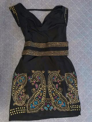Espectacular vestido con tachuelas cosidas y bordados, espalda descubierta. El cinturón es opcional es de antelina. Queda ideal.