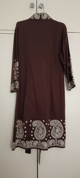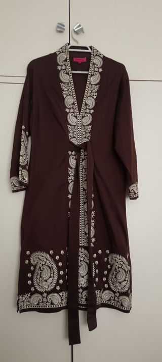 Preciosa túnica marrón chocolate con bordados blancos. Es una prenda elegante y cómoda, ideal para cualquier ocasión. - Diseño de túnica con cinturón. - algodón 97 licra 3 -largo 100 cms - Mangas tres cuartos. - Bordado con motivos florales y paisley en color blanco