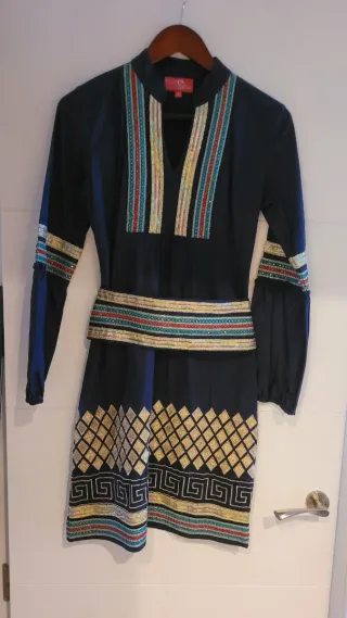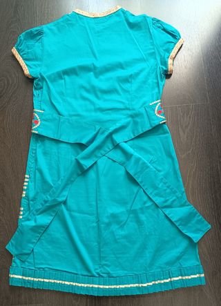 Precioso vestido de la marca Chatik & Kertan, talla L. Es de color turquesa con detalles dorados. Luce bordado artesanal y un cinturón a juego. ¡Una prenda única para tu armario! Costo 49,99€