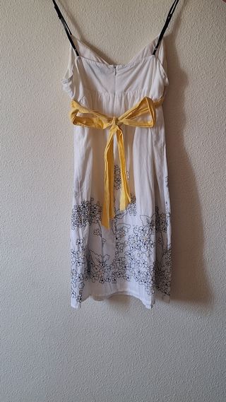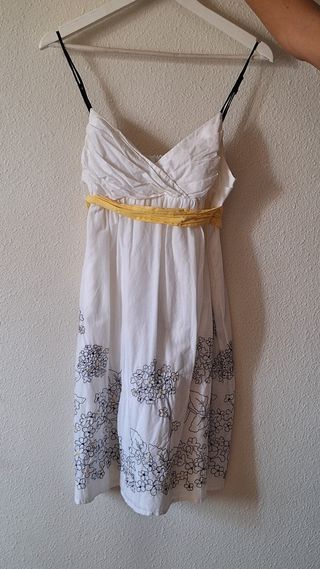 Vestido corto. Tirantes regulables. - Cuerpo fruncido. - Cinturón amarillo. - Estampado floral bordado en el bajo.