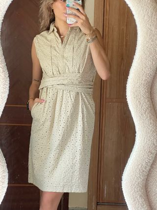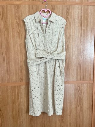 Vestido de corte camisero con detalle de bordado inglés. - Diseño sin mangas. - Cinturón a juego. - Cuello camisero.