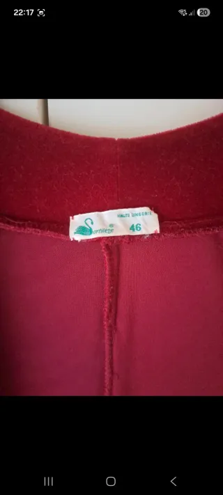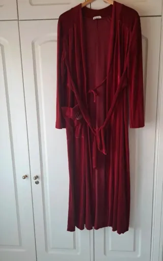 Elegante bata larga de terciopelo en un vibrante color rojo. Un toque vintage para tu día a día. Etiqueta haute lingerie talla 46. En buen estado sin desperfectos, se mantiene guardada sin usar. - Tejido suave y agradable al tacto. - Diseño largo con cinturón para ajustar. - Detalle logotipo marca bordado en el bolsillo.