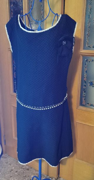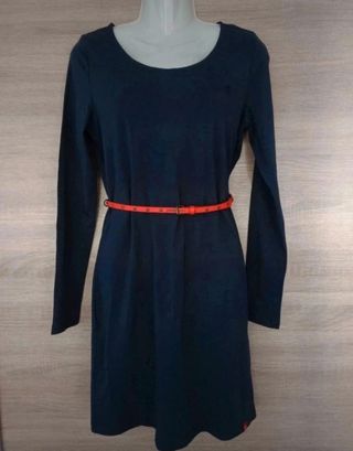 Vestido de manga larga, una puesta, como nuevo. Largo 90 centímetros. Logo bordado. Ideal para la primavera o los días más frescos de verano. Es elástico. 94% algodón, 6% elastano. Falta el cinturón, pero se puede combinar con cualquier otro. Color azul marino. Sencillo, pero queda elegante