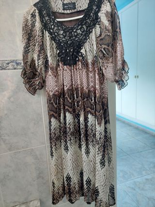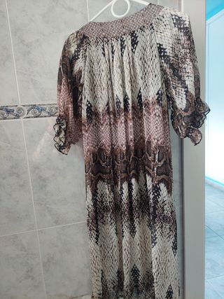 Vestido de gasa vaporoso vestidor. Estampado de color beis y marrón. bordado y lentejuelas en el pecho Manga semi-corta Se puede llevar suelto o con cinturón Talla única, pero puede llevarla una XL p incluso más Nunca se ha usado.Sin etiqueta.