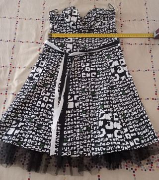 Vestido palabra de honor,con cinturon lazos raso negro y blanco como tonos del vestido, tul negro en borde inferior. Comprado en rebajas para evento que al final no fui. Pone talla 44 pero yo uso 42 y me vale. Hay medidas en imágenes.