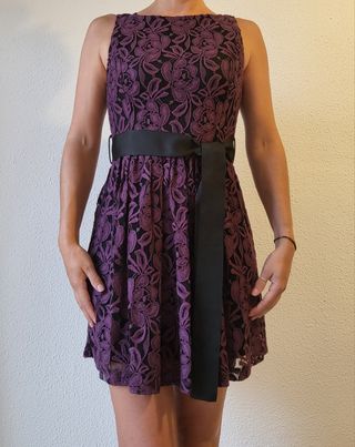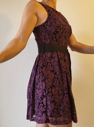 ♡Vestido corto de bordado color berenjena y encaje negro. ♡Lleva forro en negro. ♡Cinturón lazada en negro. Se puede definir con un nudo o un lazo. También se puede quitar.