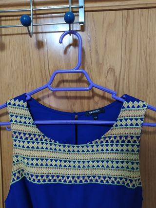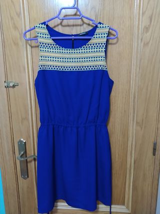 Vestido azul MORGAN, talla 42, sin mangas, con canesú bordado, cintura elástica y cinturón con borlas de pedrería de colores. Tiene forro y la tela no se arruga. Poco usado y muy bonito 🤩