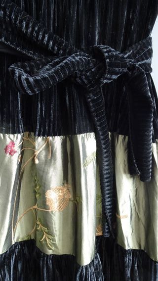 PIEZA MUY ORIGINAL . muy bonita ,mirar medidas no lleva talla. MEDIDAS: fruncida en cintura y relajada , 58 cm ,estirada la cintura al maximo102 cm CADERA al máximo 144 cm Largo total : 91 cm Con franjas en raso verdes y bordadas en flores y las franjas negras como un raso aterciopelado plisado. Lleva un cinturón de la misma tela. Hecha en España
