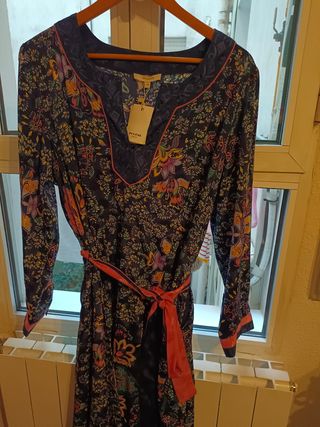 Vestido Desigual largo y bohemio con un estampado vibrante y llamativo. - Diseño con flores rojas y motivos de serpiente. - Manga larga con puño fruncido. - Cuello redondo con detalle floral bordado. - Cinturón en terciopelo. - Muy cómodo y ligero. - En perfecto estado.