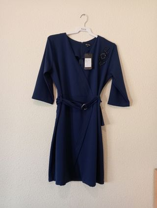 color azul marino , con una costura d adorno q parece cruzado en el lado izquierdo, con una flor bordada y con adornos en brillo sobrepuesta en el lado izquierdo del pecho, con una pequeña raja donde acaba la costura d adorno , con cinturón, también se puede llevar suelto