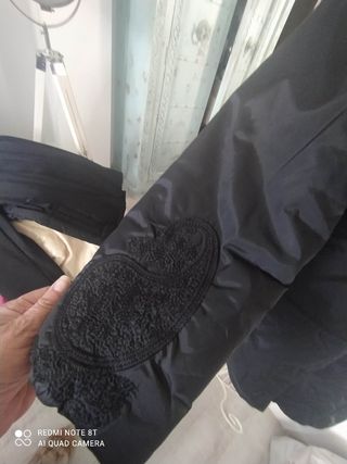 Abrigo negro muy elegante, con bolsillos y cinturón ajustable en la parte de detrás. Llega hasta la rodilla. Botones forrados con la misma tela del plumas. Con bordados muy elegantes.