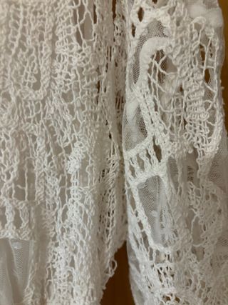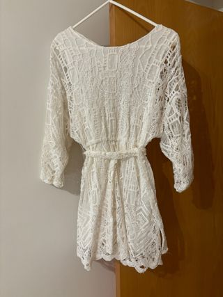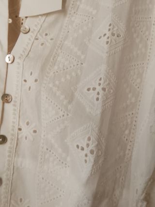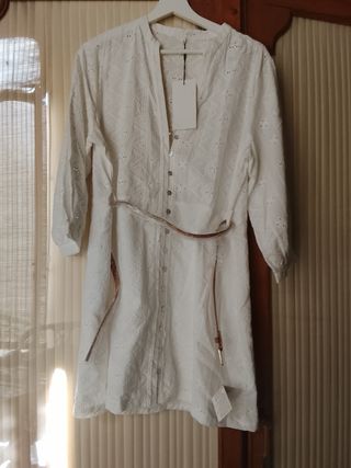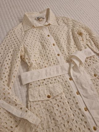 VESTIDO BORDADOS PERFORADOS Vestido corto de cuello solapa y manga larga acabada en puño. Bolsillos de plastrón con solapa y botón en delantero. Cinturón lazada. Detalle de bordados perforados. Forro interior combinado a tono. Pliegue en espalda. Cierre frontal con botones a contraste. Crudo, hueso Esta impecable, solo se ha usado en una ocasión. El forro quedaría mejor entrandolo un poco se ve en ocasiones.