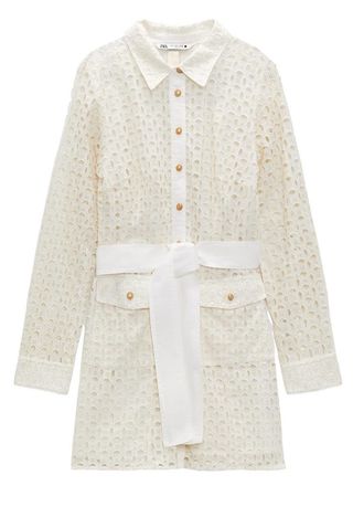Vestido blanco de Zara con un delicado bordado floral. - Diseño con cuello camisero. - Cierre de botones. - Cinturón a juego para anudar. - Manga larga con puños abotonados.