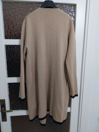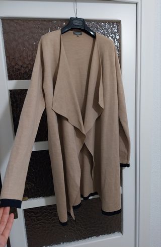 Preciosa chaqueta larga y sin cierres, con parte delantera amplia, 98% lana suave y espesa, color beige medio con borde negro en bajos y mangas, bolsillos discretos laterales. Se puede llevar abierta o con cinturón. Caida espectacular. Puesta 1 vez. Para tallas 38, 40 y 42. = Medidas en plano: largo 96cm/mangas 68cm/hombros 44cm