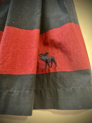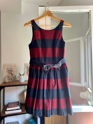 Precioso vestido de Abercrombie & Fitch a rayas. Es de color azul marino y granate, y tiene un corte favorecedor. - Talla S/M - Con cinturón - Detalle del alce de la marca bordado - 100% algodón - Nuevo tenía un precio de 80 euros En buen estado. Se aprecia algo de desgaste en una de las tiras de hilo que aguantan el cinturón. Usado 5 veces.
