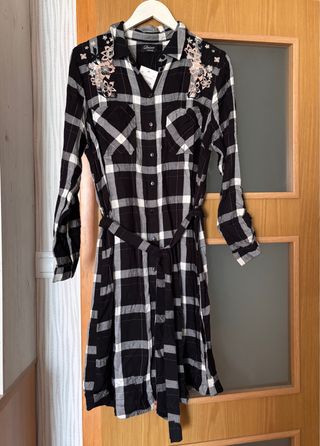 Nuevo a estrenar con etiqueta. Precioso vestido camisero en cuadros blancos y negros con bordados florales en los hombros. Cintura con cinturón. Es una prenda elegante y cómoda, ideal para cualquier ocasión. Marca: C&A Talla: 46 Medidas aproximadas: - Contorno bajo las axilas: 100 cm - Contorno de la cintura: 100 cm - Contorno de cadera: 118 cm - Largo desde el hombro: 102 cm NO ME DESPLAZO ENVÍOS A PARTIR DE 19€
