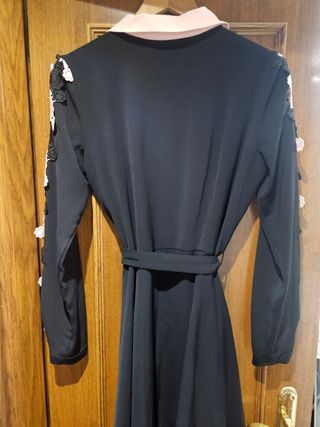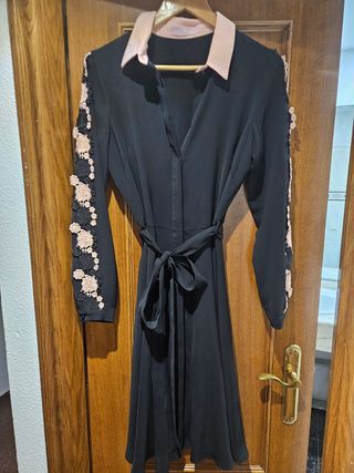 Precioso vestido negro de corte midi. Es elegante y cómodo de llevar. Cortada etiqueta interna por manía - Tiene un bonito cuello camisero rosa. - Las mangas presentan delicados bordados florales en tonos rosas y negros. - Se abrocha con botones en la parte delantera. - Incluye cinturón a juego.