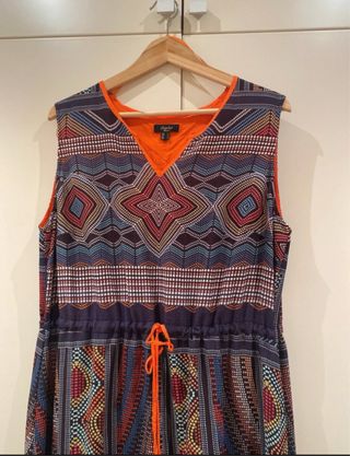 Vestido largo con un estampado geométrico vibrante y un cinturón de cordón naranja. - Diseño sin mangas. - Cuello en V con borde naranja. - Cintura con cordón ajustable.