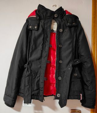 Abrigo negro acolchado con cinturón y capucha desmontable de cremallera y borde de pelo. 80 cm de largo y 45 cm de ancho de axila a axila. 4 bolsillos exteriores, los del pecho con cremallera. Puños ajustables de botón