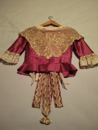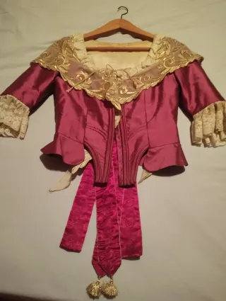Corpiño de fallera con un diseño elegante y detalles elaborados. - Tejido principal en tono burdeos satinado. - Cuello y mangas adornados con encaje y bordado dorado. - Cinturón decorativo con pasamanería dorada y flecos. No envíos.