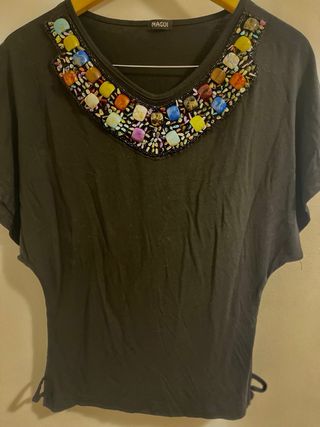 Camiseta negra con un llamativo bordado en el cuello. - Detalle de pedrería y abalorios. - Diseño con escote en V. - Mangas cortas tipo murciélago. - Material algodón - se usa con un cinturón si le apetece