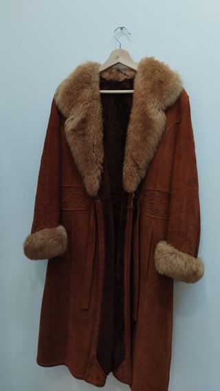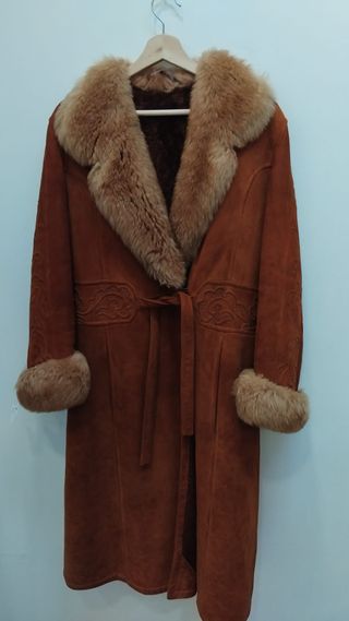 Elegante abrigo largo de ante en color teja, con un suave forro interior de pelo tipo borreguito. Detalle de cinturón para ajustar. Puños y cuello con acabado de pelo sintético. Diseño con adornos bordados en los laterales. Talla 38 / 40 ( M L) En muy buen estado. Se puede enviar o recoger en Tienda Solidaria Piel de Mariposa SEVILLA C/Feria 145 (+ info en la última foto)