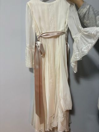Elegante vestido de ceremonia, ideal para comuniones o eventos especiales. - Diseño vaporoso y delicado. - Cinturón de satén a tono. - Mangas acampanadas con detalles de encaje. - Adornos florales bordados en el corpiño. La talla de vestido 12 años