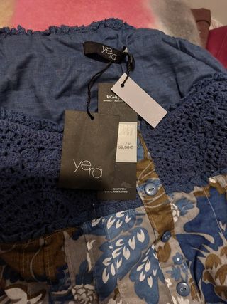 NUEVO, con etiqueta de la Marca YERA t 42 en tonos azulados- morados detalle floral manga versátil al hombro o caída, cuello caja, detalles de bordados abajo y escote. 100 % algodón. Tb se puede usar como Bluson overside y /o acompañado de un cinturón. Muy estiloso.