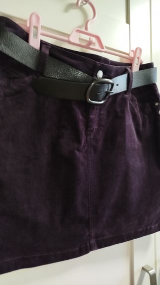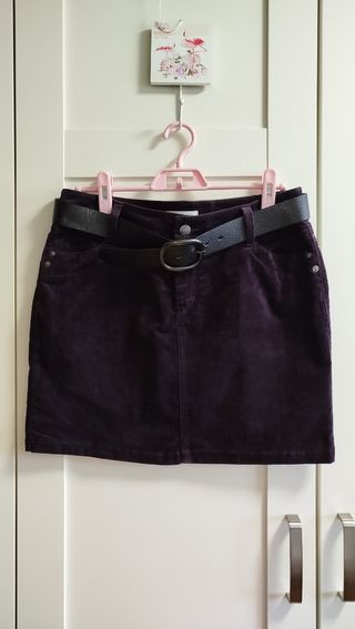 Minifalda a estrenar un solo uso, está perfecta. Es color morado oscuro,tejido de pana y elástica, lleva cinturón. Tienes todas las medidas en las fotos. Y más de 150 prendas en mi perfil que puedes ver de niña de 2 a 14 años, mujer, tallas grandes y curvy. Hago lotes para que ahorres