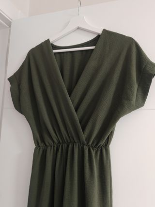 Precioso mono de color verde oliva, ideal para cualquier ocasión. - Diseño cruzado en el pecho. - Cintura elástica con enganches a cada lado para poner cinturón si se quiere. - Mangas cortas. - Corte amplio y fluido. Talla única, ideal desde S a L. Usado solo una vez. Perfecto estado