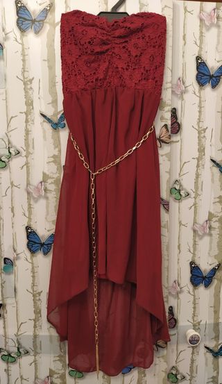 HAGO ENVÍO POR EL BOTÓN DE COMPRAR DE WALLAPOP. Bonito vestido de Fiesta granate de italia . Elástico , talla única . Sin tirantes . Por delante más corto y por detrás largo. Medida largo delantero 62cm largo y largo por detrás 80cm. Con su cinturon de cadena dorada, solo puesto 1 vez . yo soy talla S . pero es talla única