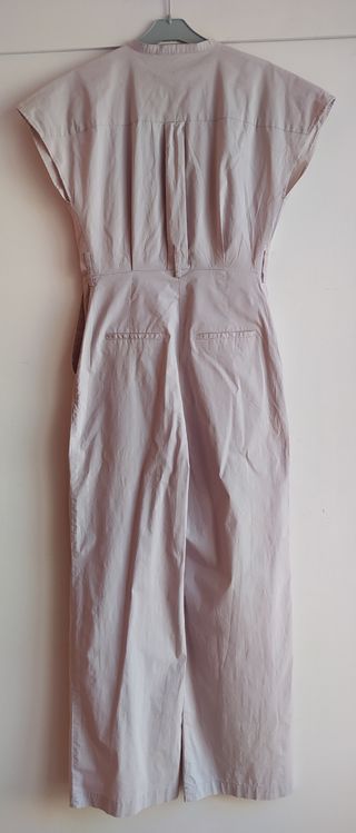 Puesto solamente una vez, me queda un pelín pequeño. La tela es muy fresquita, un poco elástica, contiene 97%algodon y 3%elastan. No tiene cinturón, la compré sin el cinturón. Es la talla XS, creo que vale para una talla 34-36, yo gasto una 38 y me queda muy ajustado. Dejo las medidas para evitar cualquier confusión sobre la talla. Hombros (caídos) 60 cm Pecho 46 cm Cintura 36 cm Largo desde hombro 145,5 cm Largo desde la cintura 105 cm Ancho pierna 26 cm