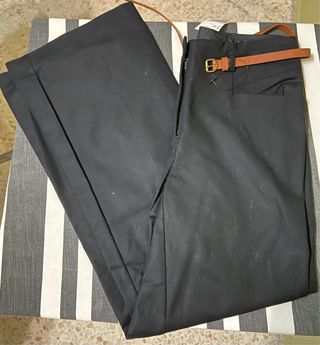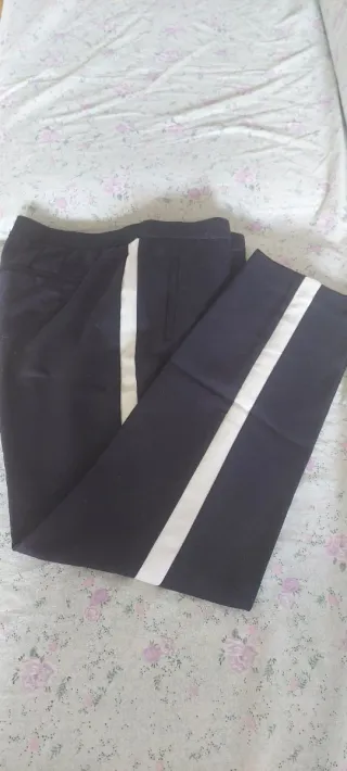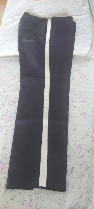Pantalón clásico de Zara color azul marino con raya lateral blanca. Bolsillos simulados. La parte de atrás del cinturón es goma. Tela de algodón un poco elástica. Mide 42 cm de cintura y 94 de largo. Talla 42.