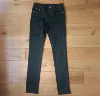 Pantalón de corte ajustado y tejido elástico. El color es un verde muy oscuro, casi negro. - Cintura con trabillas para cinturón. - Cierre de botón y cremallera. - Bolsillos delanteros y traseros.