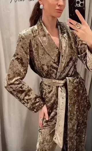 Conjunto de dos piezas formado por chaqueta y pantalón. Blazer con cinturón ancho de terciopelo Pantalón ancho, pernera abullonada terminada en elástico, cintura alta Disponible en talla M y L