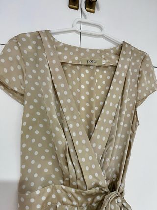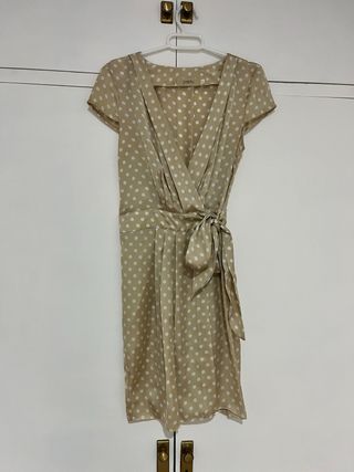 Vestido corto con estampado de lunares. - Diseño cruzado. - Cinturón anudado. - Manga corta. Vestido corto de lunares beiges y blanco con cintura cruzada y elástico en la parte trasera con lo que es ajustable. Ligero y favorecedor. talla M. Largo 90cm Sisa 42 cm aprox #vestidocortolunares #vestidolunaresmujer #dress #shortdress