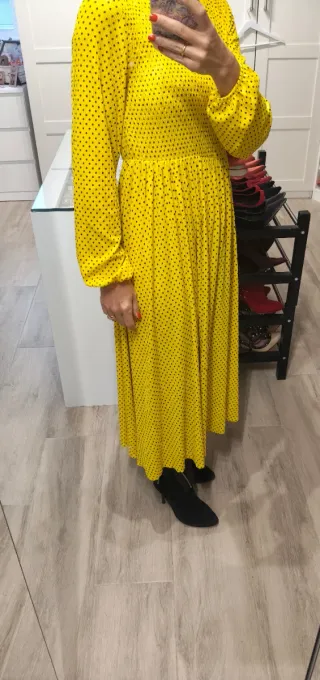 Vestido de la marca Zara. Talla S (yo diría que es más bien una talla M, no obstante ver medidas en las fotos). En perfecto estado. De color amarillo con puntitos negros. Es muy cómodo. Queda muy bonito con un cinturón gordo de color negro. Vestido largo de la marca Zara con un estampado de lunares. - Diseño con manga larga abullonada. - Cintura elástica fruncida. - Largo hasta los tobillos.
