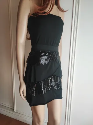 Vestido negro con volantes lisos combinado con lentejuelas. Escote palabra de honor. Elástico. Lleva una gomita en la cintura a modo de cinturón fijo. Está nuevo. Talla L Os regalo 🎁 la chaqueta de rayas en blanco y negro de New Colección. Talla L