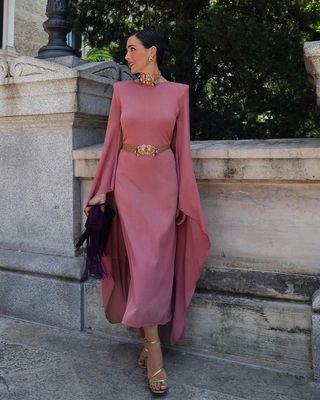 Vestido largo en tejido de punto elástico color rosa, con detalle de capa. No incluye cinturón ni hombreras.