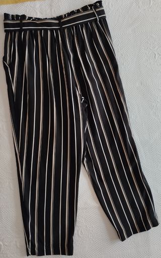 Pantalón de rayas de color negro, beige y blanco. Cintura alta con elástico en la parte trasera y cinturón del mismo tejido, también con bolsillos. Usado muy poco MEDIDAS Cintura 40cm, con el elástico totalmente estirado 50cm Largo medido desde el cruce de la entrepierna 64cm Largo medido desde la cintura 94cm