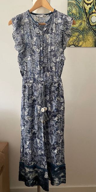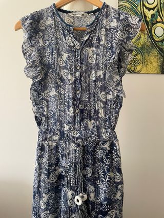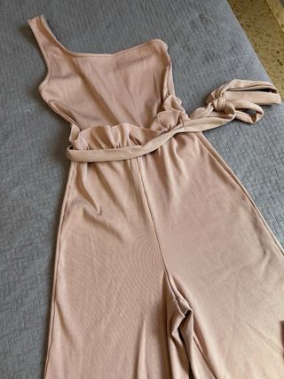 Mono a estrenar sin etiqueta. Talla XS, vale para S. Tejido de lyocell fluido. Diseño largo y recto con cuello clásico. Manga corta con dos bolsillos de solapa en el pecho y cintura elástica. Lazo ajustable en la cintura, trabillas y cierre de botones en la parte delantera.