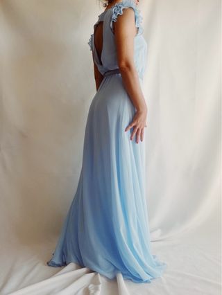 Precioso vestido largo de la marca Poète. Es de color azul cielo y tiene un diseño elegante y sofisticado. - Escote en la espalda. - Falda fluida. - Cintura marcada con cinturón. - Manga corta con volantes. Largo largo por los laterales. Manga con volante, escote en la espalda. Cintura elástica. Forro. Medidas: longitud 150cm-156cm, contorno de pecho 96cm, cintura son estirar 64cm, estirando 90cm Talla 2 en etiqueta, equivale a talla S/M Estado: muy buen estado. Como nuevo.