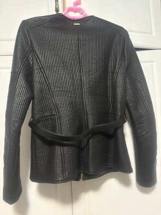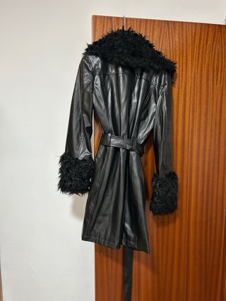 Chaqueta estilo biker con acabado en polipiel. Presenta un diseño moderno y detalles que la hacen única.tiene una pequeña data comp se ve en la foto - Cuello con pelo sintético. - Cinturón ajustable a la cintura. - Puños con cremallera. - Diseño acolchado en hombros y mangas.