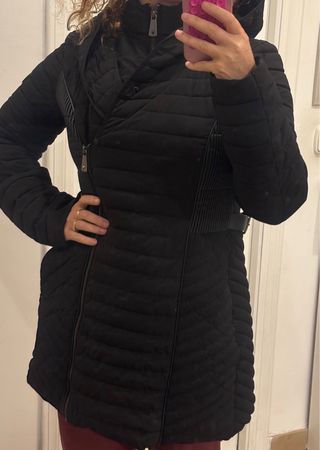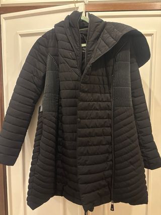 Elegante abrigo de la marca Guess en color negro. Presenta un diseño acolchado con detalles de rombos en la parte superior y un cinturón que marca la cintura. - Capucha con pelo sintético. - Cierre de cremallera. - Puños ajustados. Está nuevo, se ha usado en dos ocasiones muy poco rato. No tiene ningún desperfecto! Abriga muchisimo.