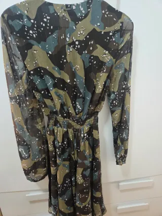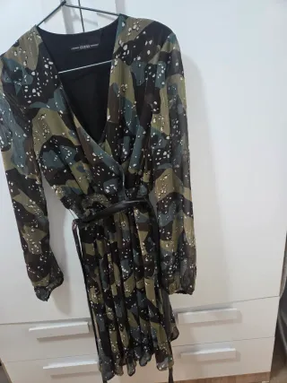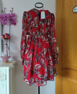 Talla S, usado una vez. Ceñido a la cintura, con cinturón efecto piel. Con forro y por debajo dd la rodilla. Para alguien de 155 cm y 57 kg queda perfecto. - Diseño cruzado. - Cinturón fino negro. - Mangas largas abullonadas. - Falda plisada.