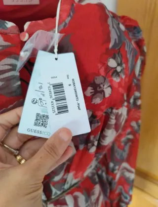 Vestido de la marca Guess con un estampado floral vibrante. El diseño presenta mangas largas y un cinturón para ajustar la silueta. - Estampado floral sobre fondo rojo. - Mangas largas abullonadas. - Cinturón de cuerda con detalles de flecos.
