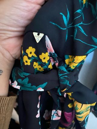 Mono de la marca Guess con un estampado floral vibrante sobre fondo negro. Presenta un diseño cruzado en la parte delantera y un cinturón para ajustar a la cintura. - Manga larga. - Estampado floral multicolor.