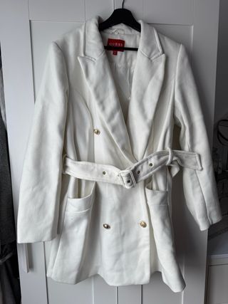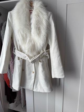 Elegante abrigo de Guess en color hueso, con un distintivo cuello de pelo sintético. - Diseño con cinturón para ajustar. - Cierre de botones. - Bolsillos frontales. en perfectas condiciones y es original traído de usa precio negociable