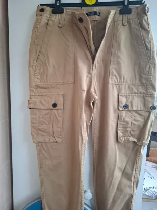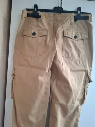 Pantalón de estilo cargo en color beige, ideal para un look casual. - Es un pantalón nuevo .Solo se ha puesto una vez. Super bonito. Lleva goma. en los bajos - Cierre de cremallera y botón. - Bolsillos laterales con botón. - Cintura con trabillas para cinturón.