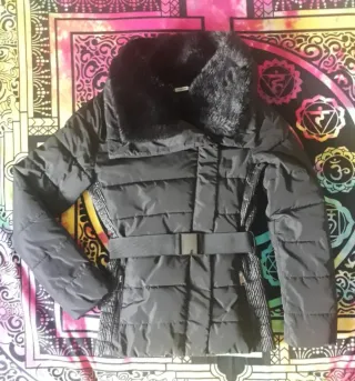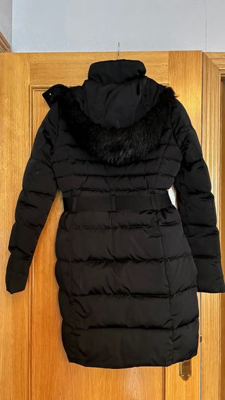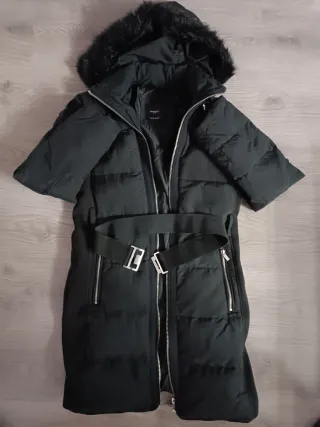 Abrigo acolchado con cinturón y cuello de pelo sintético. Bolsillos con cremallera a los laterales y cinturón con hebilla metálica con posibilidad de quitarlo. Color: Negro (Puede verse en las imágenes de otro color porque mi cámara no es buena). Talla: XS - 34/36 Marca: Amisu - New Yorker
